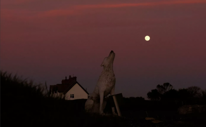 Dolunay, İngiltere'nin Hunstanton kentinde bir kurt heykelinin üzerinde yükseliyor