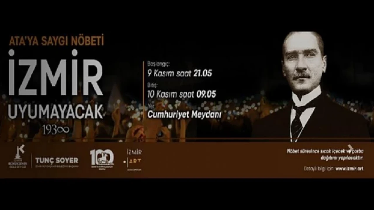 İzmir Büyükşehir Belediyesi ölümünün 84. yıl dönümünde Ulu Önder Mustafa Kemal Atatürk'ü anmak için saygı nöbeti düzenliyor. Nöbet 9 Kasım saat 21.05'ten 10 Kasım 09.05'e kadar sürecek. Cumhuriyet Meydanı'nda tutulacak nöbet için özel ışıklandırmayla “1938 sonsuzluk sembolü” çizilecek. Sembolün pek çok noktasında ise 30 dakikalık ve bir saatlik dönüşümlerle sabaha kadar saygı duruşunda bulunulacak.