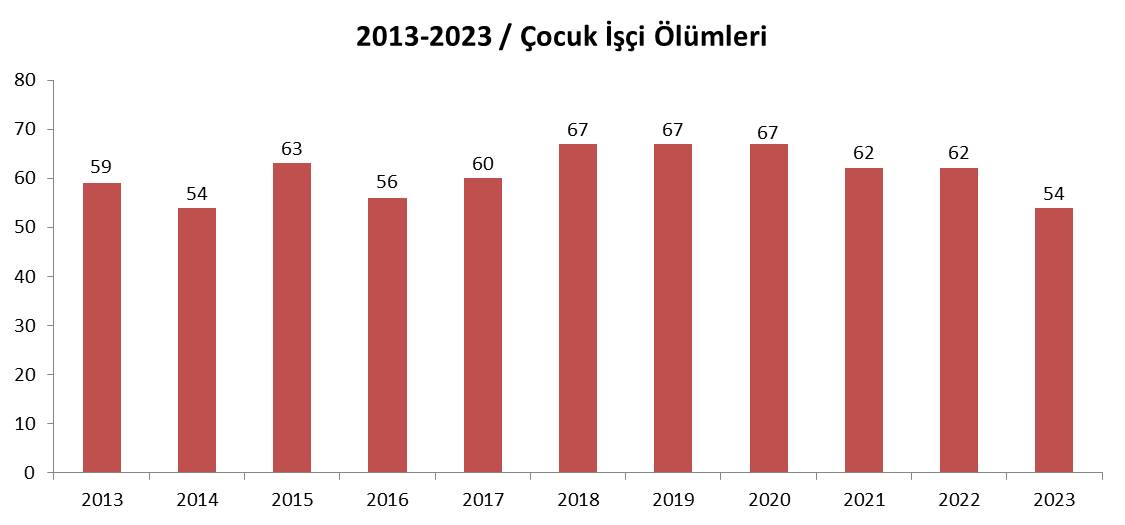Yıllara göre dağılıma bakıldığında, 2013 yılında en az 59 çocuk işçi, 2014 yılında en az 54 çocuk işçi, 2015 yılında en az 63 çocuk işçi, 2016 yılında en az 56 çocuk işçi, 2017 yılında en az 60 çocuk işçi, 2018 yılında en az 67 çocuk işçi, 2019 yılında en az 67 çocuk işçi, 2020 yılında en az 67 çocuk işçi, 2021 yılında en az 62 çocuk işçi, 2022 yılında en az 62 çocuk işçi, 2023 yılında en az 54 çocuk işçi yaşamını yitirdi.