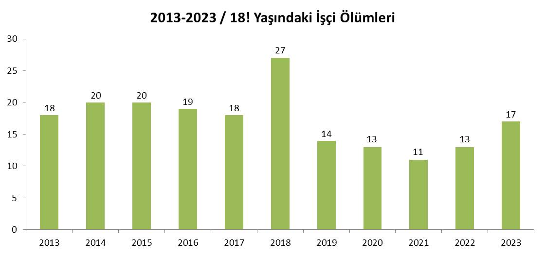 Buna göre, 2013 yılında en az 18, 2014 yılında en az 20, 2015 yılında en az 20, 2016 yılında en az 19, 2017 yılında en az 18, 2018 yılında en az 27, 2019 yılında en az 14, 2020 yılında en az 13, 2021 yılında en az 11, 2022 yılında en az 13 ve 2023 yılında en az 17 “on sekiz yaşındaki işçi” hayatını kaybetti. Buna göre, tek tek yaş bilgilerinin teyit edilmesi gereken 18 yaşındaki 180 işçi son 11 yılda hayatını kaybetti.