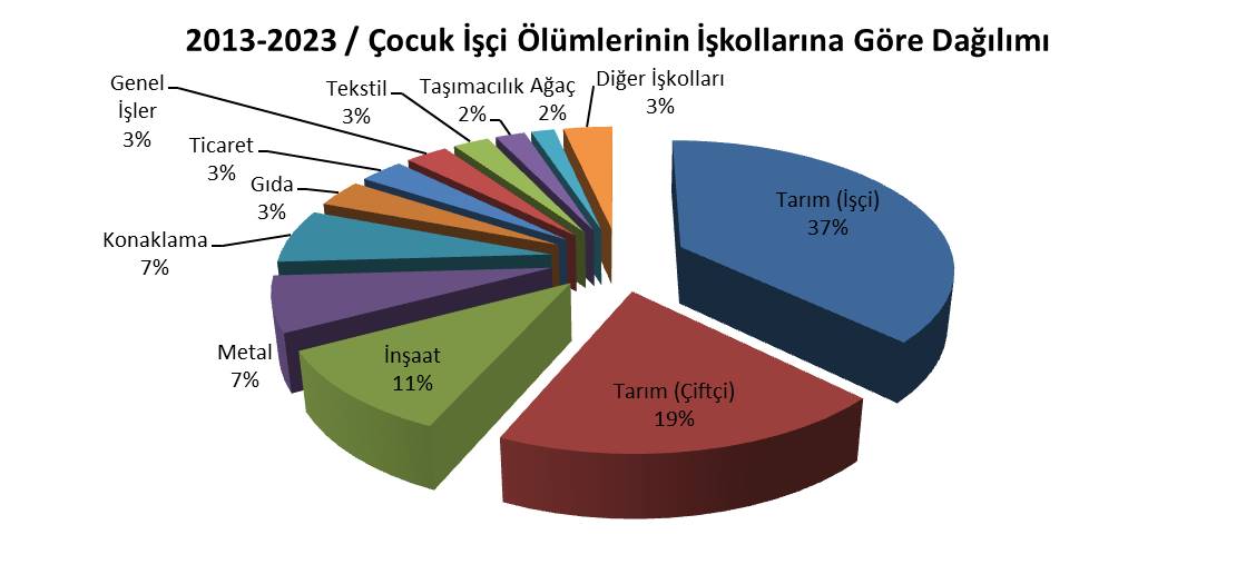 2013-2023 yıllarında çocuk iş cinayetlerinin işkollarına göre dağılımı şöyle: