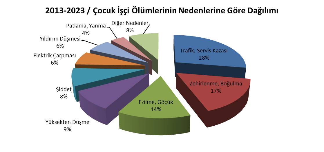 Trafik, Servis Kazası nedeniyle 186 çocuk; Zehirlenme, Boğulma nedeniyle 112 çocuk; Ezilme, Göçük nedeniyle 92 çocuk; Yüksekten Düşme nedeniyle 61 çocuk; Şiddet nedeniyle 56 çocuk; Elektrik Çarpması nedeniyle 44 çocuk; Yıldırım Düşmesi nedeniyle 41 çocuk; Patlama, Yanma nedeniyle 25 çocuk; Kalp Krizi, Beyin Kanaması nedeniyle 14 çocuk; Kesilme, Kopma nedeniyle 13 çocuk; İntihar nedeniyle 9 çocuk; Nesne Çarpması, Düşmesi nedeniyle 8 çocuk; Diğer nedenlerden dolayı 10 çocuk işçi çalışırken hayatını kaybetti.