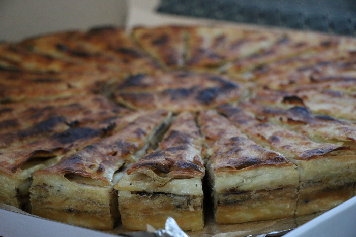 Hazırlanan hamur tereyağı sürülmüş tepsiye kat kat dökülüyor, aralarına ise kaymak ve tercihen tereyağı ya da ayçiçeği yağı sürülüyor.