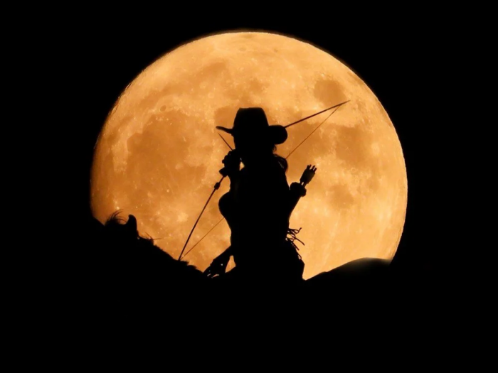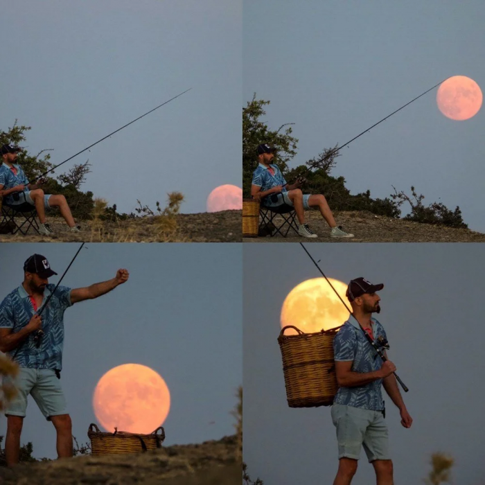 ‘Mersin Balığı Ayı’ olarak bilinen ağustos ayında Uşak Ulubey’de kaydedilen fotoğrafa bir kişinin dolunayı balık tutar gibi tutmaya çalıştığı ve sırtındaki sepette taşımaya çalıştığı yansıtıldı.