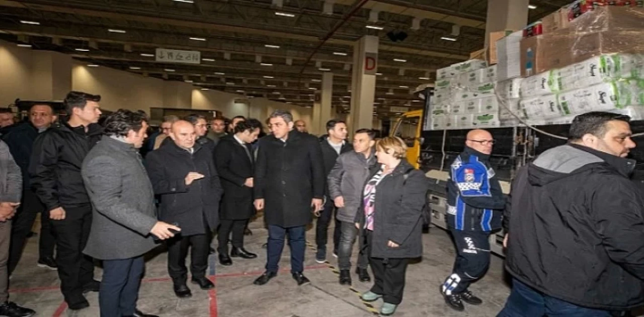 İzmir Büyükşehir Belediye Başkanı Tunç Soyer, depremzedelere gidecek yardımların toplanma noktası Fuar İzmir'i ziyaret etti. Başkan Soyer'e Gaziemir Belediye Başkanı Halil Arda ile eşi Deniz Arda, İZFAŞ Genel Müdürü Canan Karaosmanoğlu Alıcı, İzmir Büyükşehir Belediyesi bürokratları ve belediyeye bağlı şirketlerin müdürleri ve çalışanları eşlik etti.