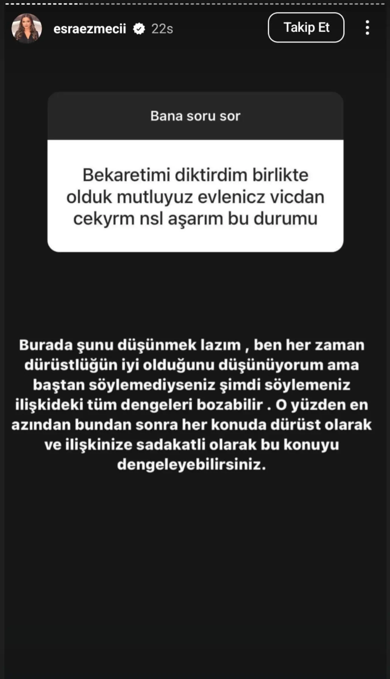 Esra Ezmeci'nin sosyal medya hesabından yaptığı paylaşımda bir takipçisi, "Bekaretimi diktirdim, birlikte olduk, mutluyuz, evleneceğiz. Vicdan çekiyorum, nasıl aşarım bu durumu?" diye sordu.
