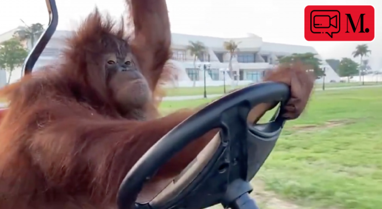 Videoda ciddi tavırlarla yaya emniyetini göz ederek araç süren orangutanın direksiyon hakimiyeti dikkat çekti.
