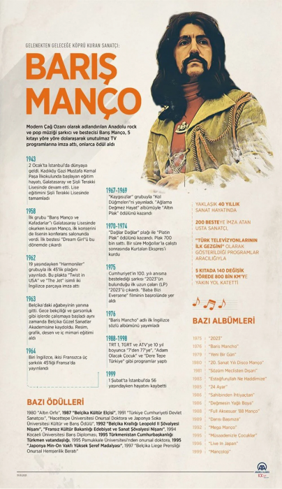 Anadolu rock ve pop müziğin önde gelen isimlerinden şarkıcı, besteci, söz yazarı ve TV programcısı Mehmet Barış Manço, vefatının 23'ncü yılında anılıyor.