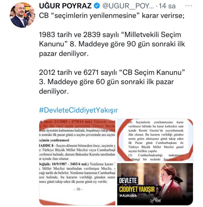 İYİ Parti Genel Sekreteri Uğur Poyraz kendi sosyal medya hesabından, seçim tarihleriyle ilgili çelişkiye dikkat çeken bir paylaşım yaptı.