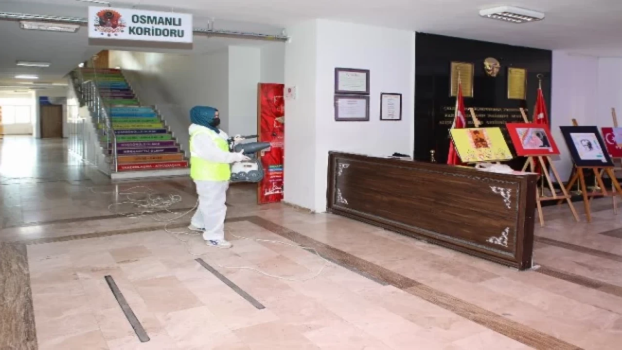 2 ekip halinde yürütülen çalışmalarda bahçeler başta olmak üzere kazan daireleri de dahil olmak üzere lavabolar ve sınıflar ile okulun her noktası temizlenip dezenfekte edildi.