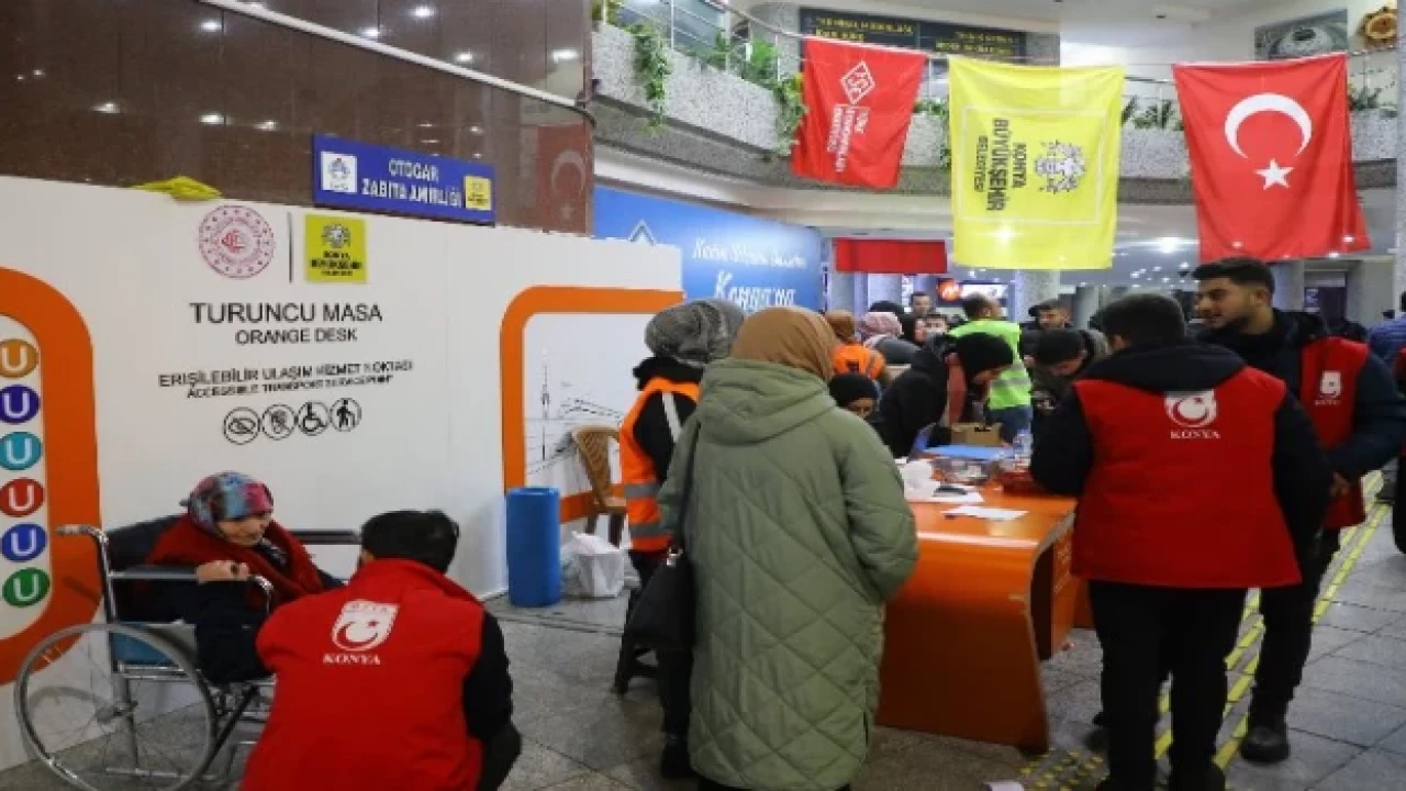 Konya Büyükşehir Belediyesi, Konya Şehirlerarası Otobüs Terminali’nde sağlık kabini, afet koordinasyon masası, turuncu masa ile depremzede vatandaşlara 24 saat destek oluyor.