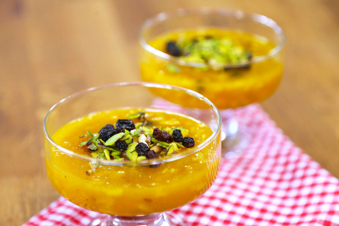 6 bardak suyu bir tencereye koyup kaynatın. Pirinci ilave edin, iyice piştikten sonra şekeri katın. 1 bardak soğuk suda safranı sulandırın, içine nişastayı da katıp karıştırın. Tencereye azar azar ilave edip kısık ateşte sürekli karıştırarak kıvamını buluncaya kadar kaynatın. Kâselere pay edip soğutun. Üzerini kuşüzümüyle süsleyerek servis yapın.