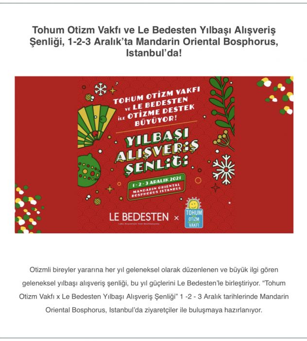 Etkinlik giriş ücreti ve katılımcı firmalardan sağlanan gelirin tamamı Tohum Otizm Vakfı’nın projelerine ve eğitim bursuna ihtiyaç duyan otizmli çocuklara aktarılacak. Bu yıl şenlik, İstanbul’un en kıymetli lokasyonunda yeni açılan Mandarin Oriental Bosphorus Istanbul’da gerçekleşti ve lüks tasarımcıların ürünlerinin yer aldığı bir platform olan Le Bedesten ile birlikte birçok tanınmış marka sosyal sorumluluk bilinci ile şenlikte yerini aldı.