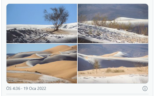 Ayn Sefra'da son 52 yılda beşinci kez kar yağışının görüldüğü belirtildi. Cezayir'in bu küçük ilçesinde daha önce 1979, 2016, 2018 ve 2021 yıllarında kar yağmıştı.