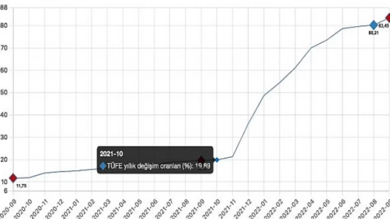 TÜFE’deki (2003=100) değişim 2022 yılı Eylül ayında bir önceki aya göre 3,08, bir önceki yılın Aralık ayına göre 52,40, bir önceki yılın aynı ayına göre 83,45 ve on iki aylık ortalamalara göre 59,91 olarak gerçekleşti. TÜFE değişim oranları (), Eylül 2022