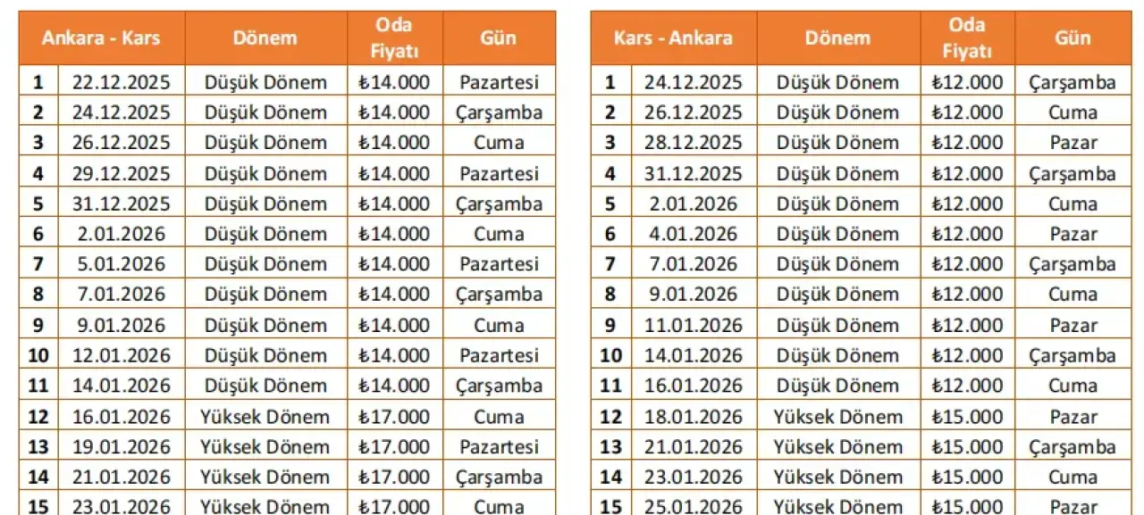 Ankara - Kars hattında tren, 22 Aralık 2025 - 27 Şubat 2026 döneminde pazartesi, çarşamba ve cuma, Kars - Ankara yönünde ise çarşamba, cuma ve pazar olmak üzere toplam 60 sefer gerçekleştirecek.