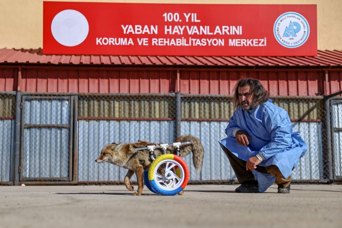 Van'da trafik kazası sonucu arka bacakları felç olan tilki, Van Yüzüncü Yıl Üniversitesi (YYÜ) Yaban Hayvanları Koruma Rehabilitasyon Merkezince geliştirilen yürüteçle hayata tutundu.