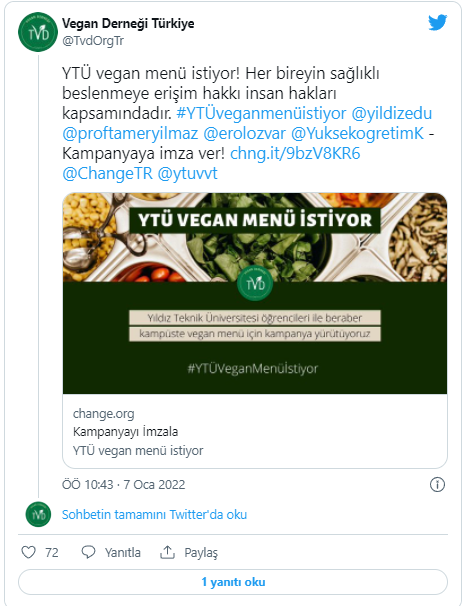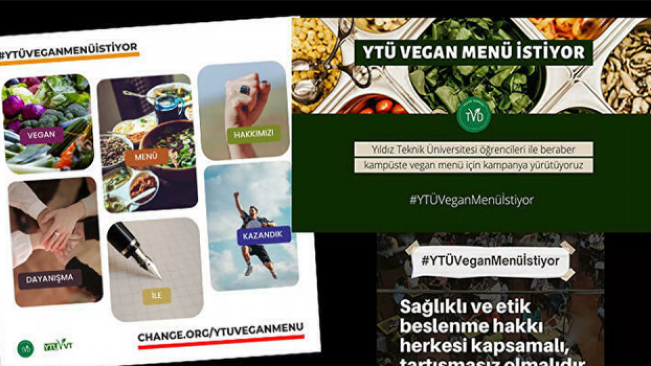 YTÜ Vegan Vejetaryenler Topluluğu (YTÜ VVT) ile Vegan Derneği Türkiye'nin (TVD) birlikte "#YTÜVeganMenüİstiyor" kampanyasının sonuç verdiği açıklandı.