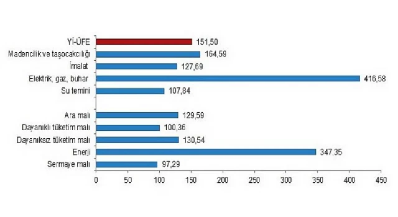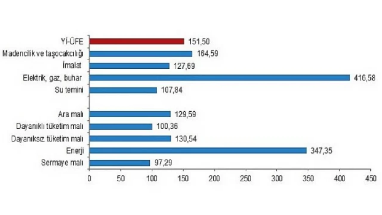 Yİ-ÜFE (2003=100) 2022 yılı Eylül ayında bir önceki aya göre 4,78, bir önceki yılın Aralık ayına göre 82,45, bir önceki yılın aynı ayına göre 151,50 ve on iki aylık ortalamalara göre 114,02 artış gösterdi.